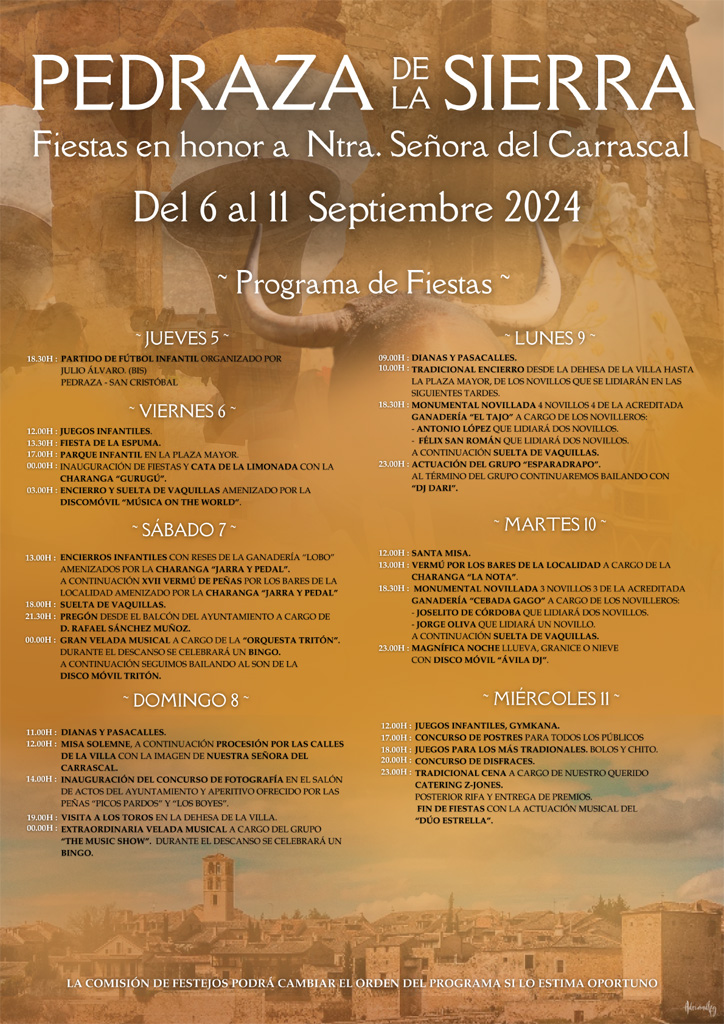 FIESTAS EN HONOR A Ntra. SEÑORA DEL CARRASCAL PEDRAZA 2024 FIESTAS EN HONOR A Ntra. SEÑORA DEL CARRASCAL PEDRAZA 2024 Pedraza de la Sierra. Fiestas en honor a Nuestra Señora de Carrascal del 6 al 11 de Septiembre 2024. Documentos CARTEL FIESTAS PEDRAZA 2024.pdf (pdf 2,2 MB)
