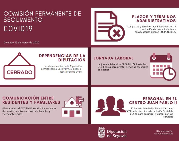 La Comisión Permanente de Seguimiento del COVID-19 de la Diputación de Segovia ha decidido esta mañana eliminar la atención presencial a los ciudadanos en cualquier oficina de la institución provincial. De esta manera, la atención será de carácter telefónico y telemático (en este enlace se puede acceder al directorio de todos los servicios: https://www.dipsegovia.es/telefonos).
