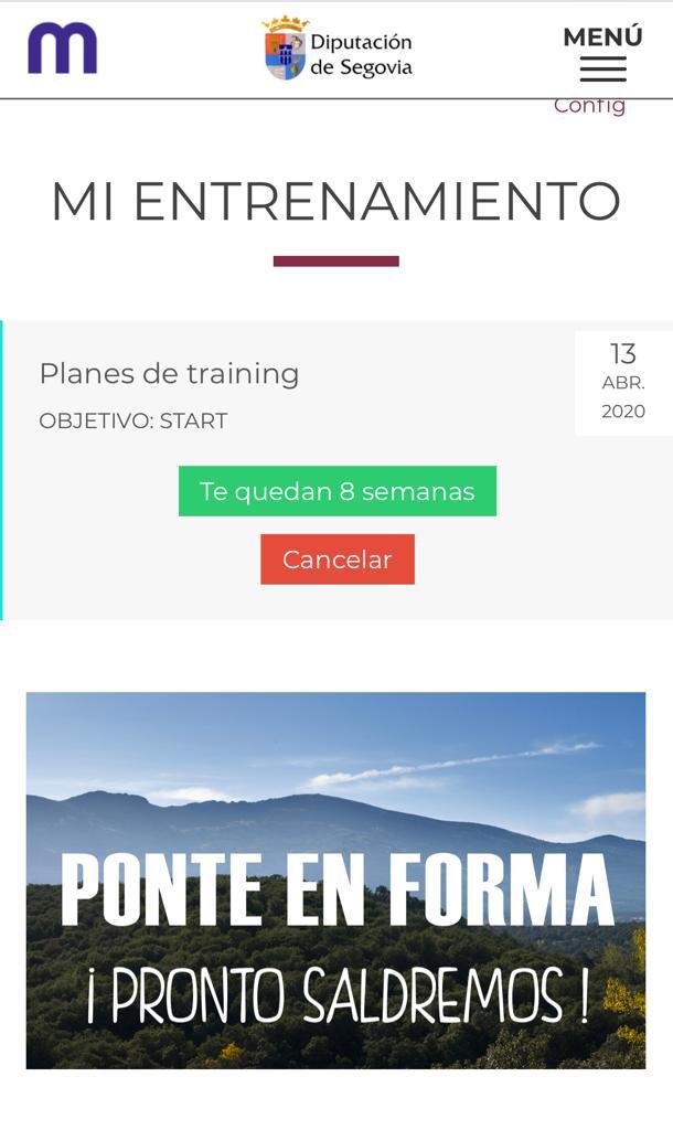 Desarrollado por las empresas TECH friendly y Runnea, esta aplicación web ayuda a los territorios a activar y mejorar la forma física de su ciudadanía. La institución provincial ofrece este servicio de forma totalmente gratuita para los usuarios, con tal sólo realizar un sencillo registro a través de estos dos enlaces: www.muviment.com/training/segovia o www.segoviaturismo.es/actividades-deportivas. Con esta aplicación web, "pretendemos ayudar a los vecinos de nuestros pueblos a que se tomen una actitud activa en esta cuarentena provocada por la crisis del COVID19, y así poder evitar futuros problemas de salud derivados del sedentarismo provocado por este periodo", tal y como ha destacado la diputada de Turismo, Magdalena Rodríguez.