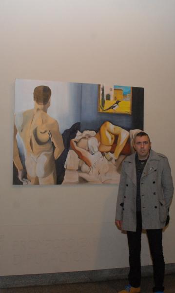 El pintor ha conseguido, a partir del poema de Gil de Biedma ‘Un cuerpo desnudo el mejor amigo del hombre', una obra de 1,56 x 1,17 metros, en el que el tratamiento de dibujo clásico enmarca el óleo diluido, definiendo una escena enfocada; en ella aparece un hombre con el torso desnudo en primer plano, y al fondo una cama deshecha.